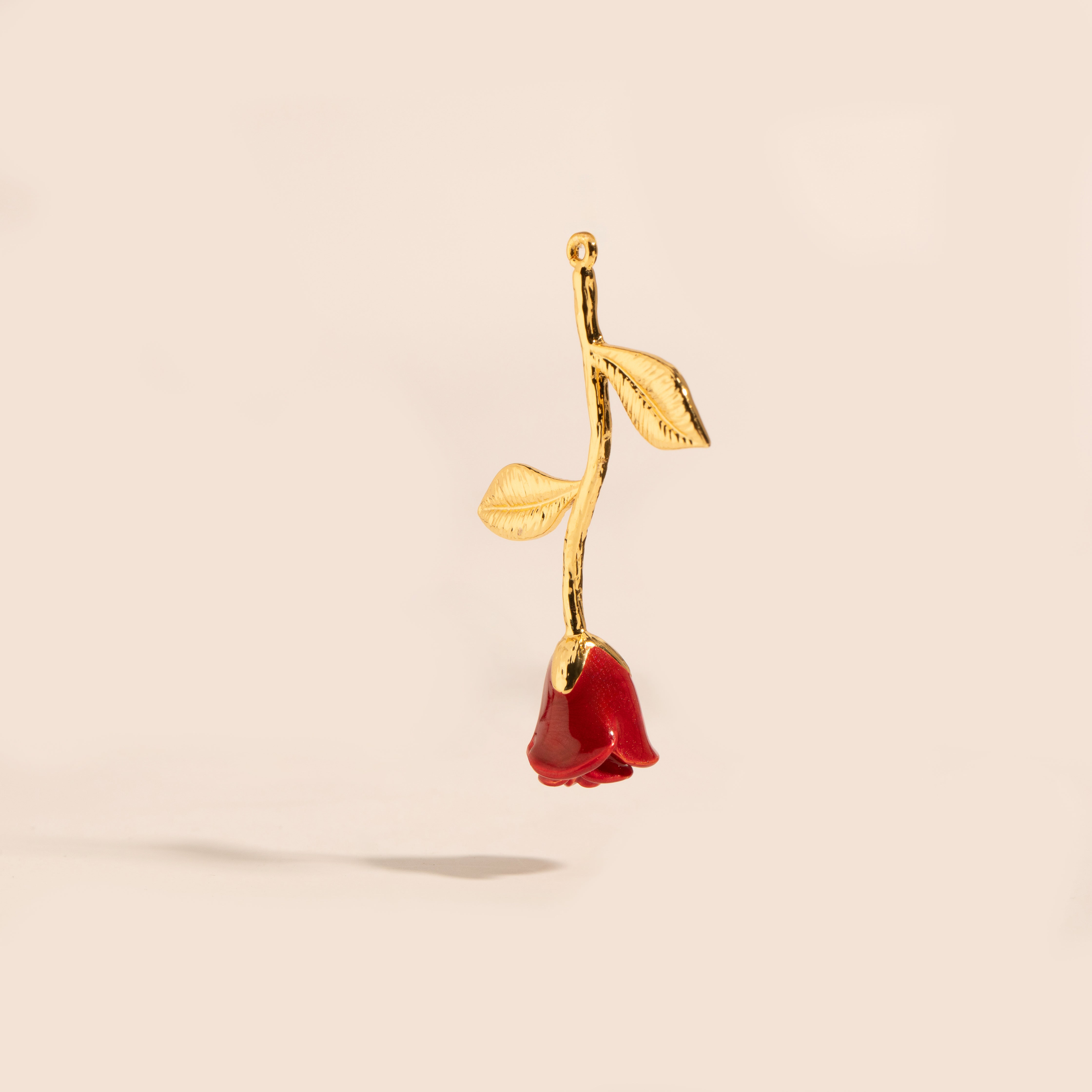 A gold-colored charm in the shape of a red rose with a leafy stem and a red flower.