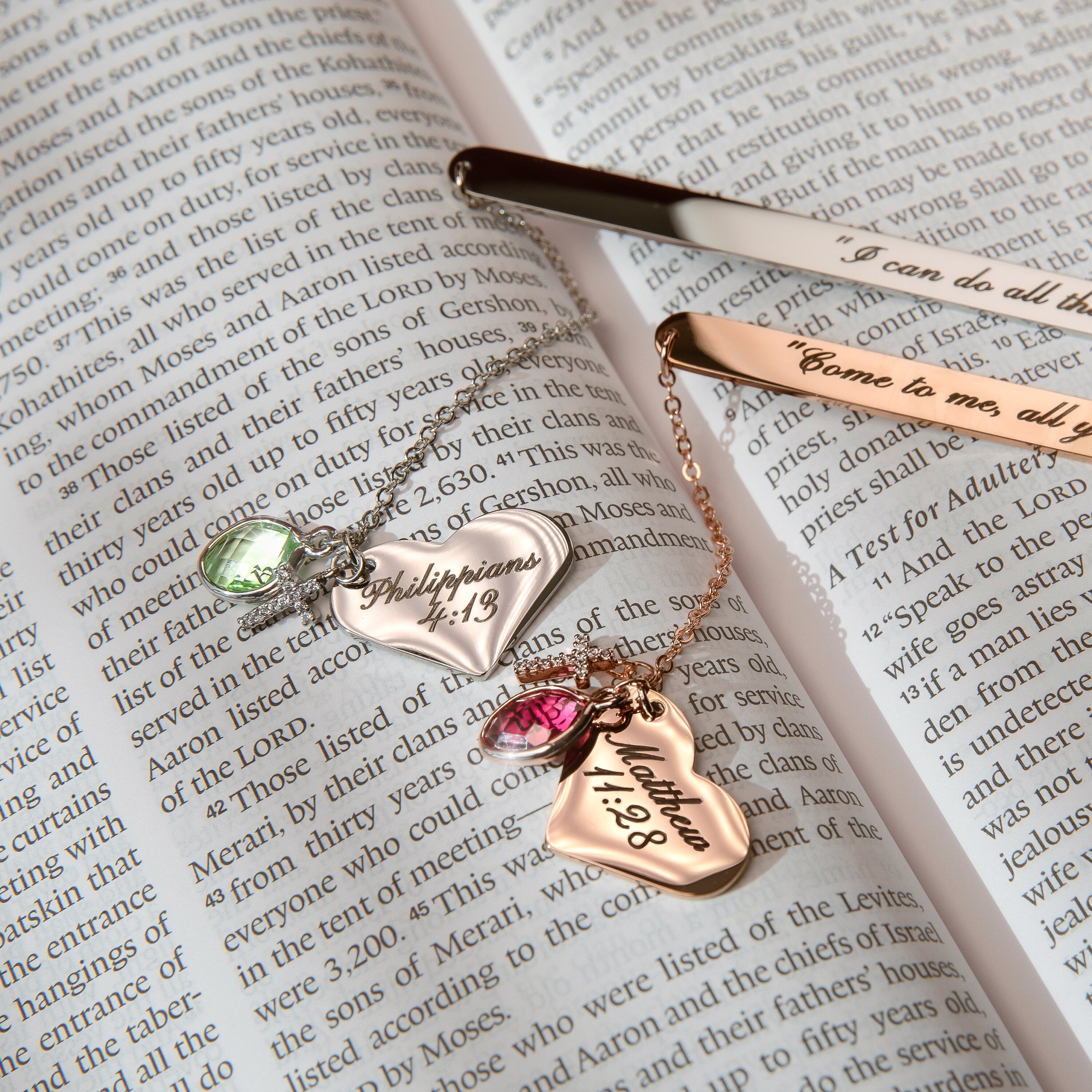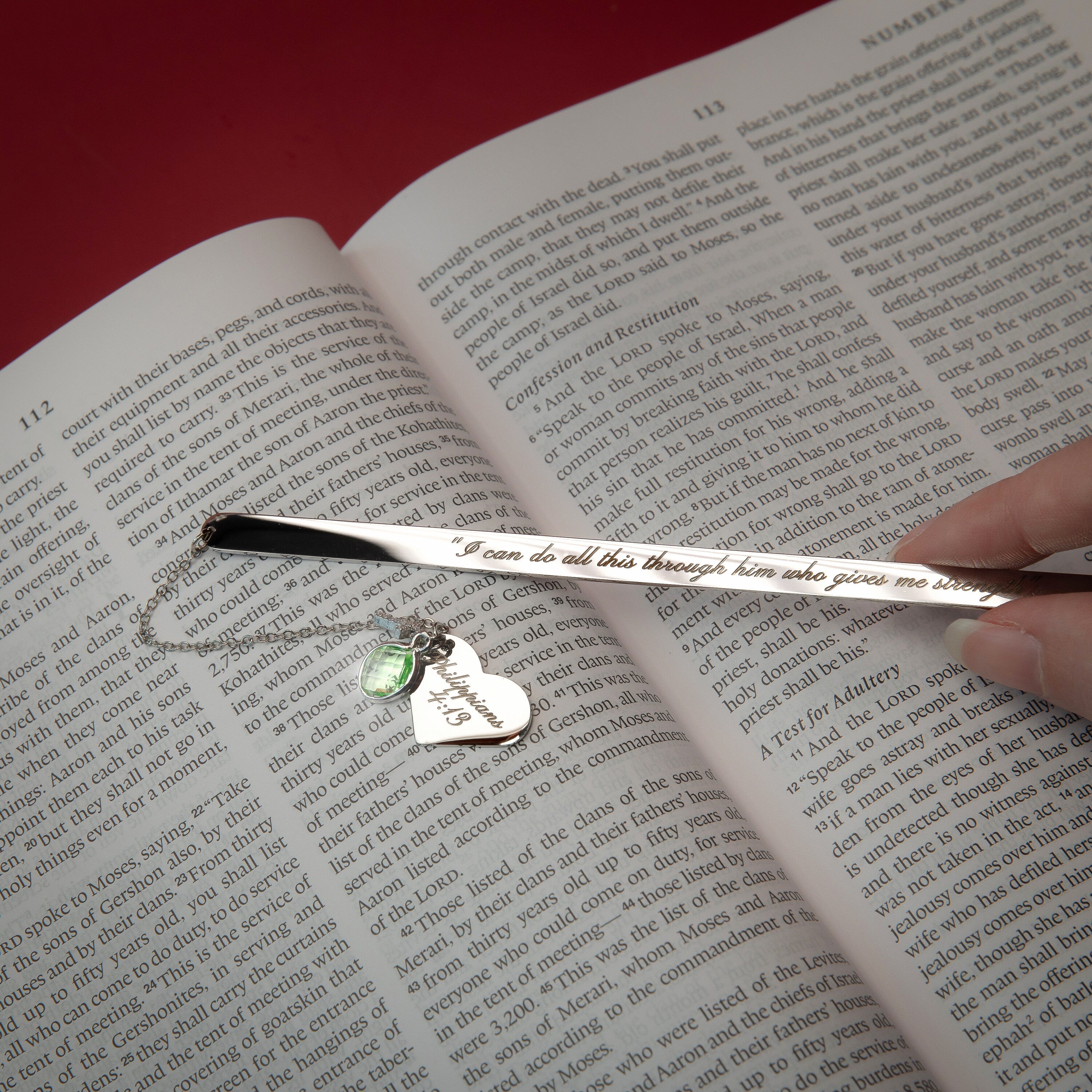 Deepen your spiritual journey with our Personalized Bible Bookmark, a beautifully crafted keepsake that combines faith and elegance. Made from high-quality plated stainless steel, this bookmark features delicate charms — a heart, cross, and birthstone — symbolizing love, devotion, and divine light. Personalize it with your favorite Bible verse to create a meaningful reminder of faith and inspiration. A thoughtful and enduring gift for birthdays, holidays, or any occasion of spiritual significance.