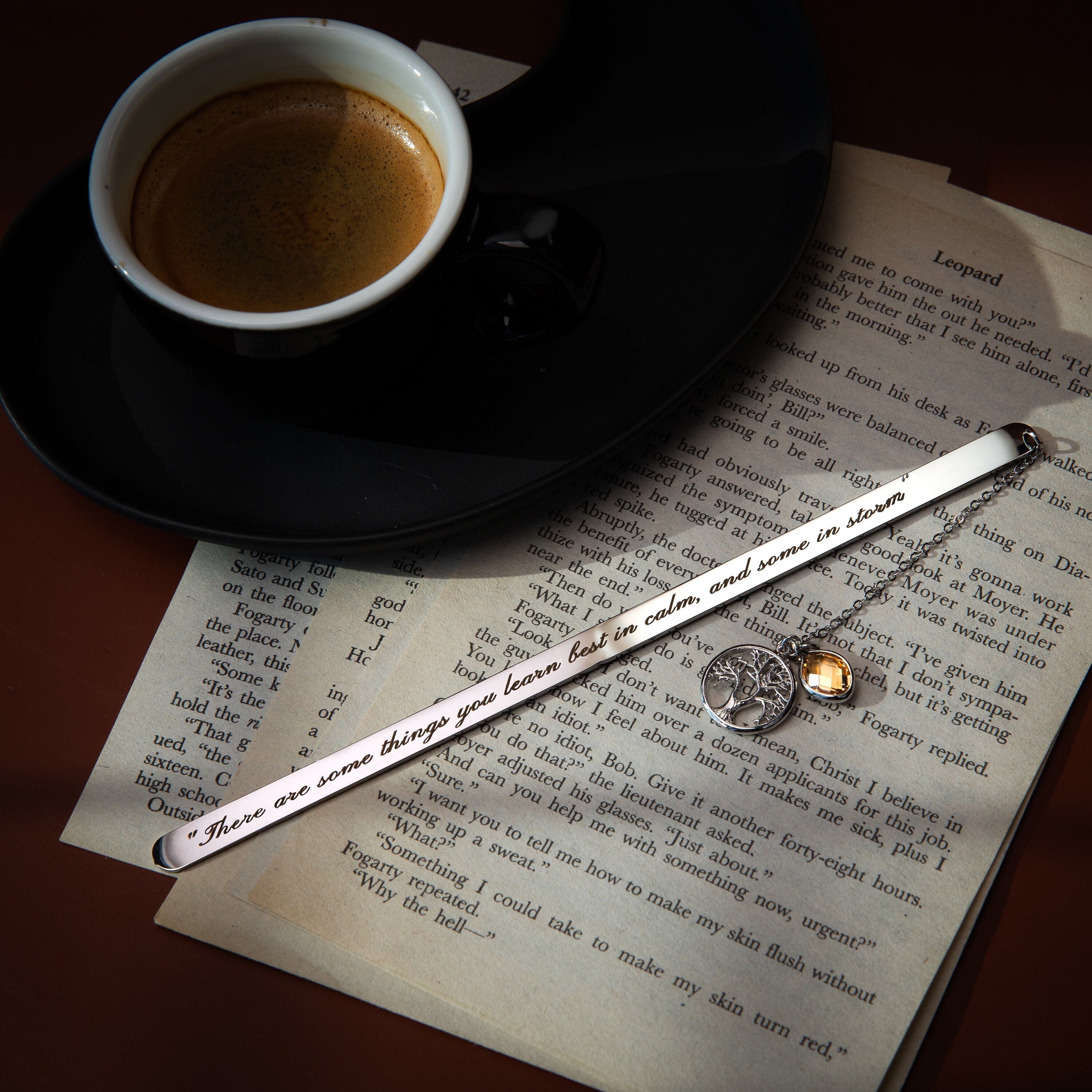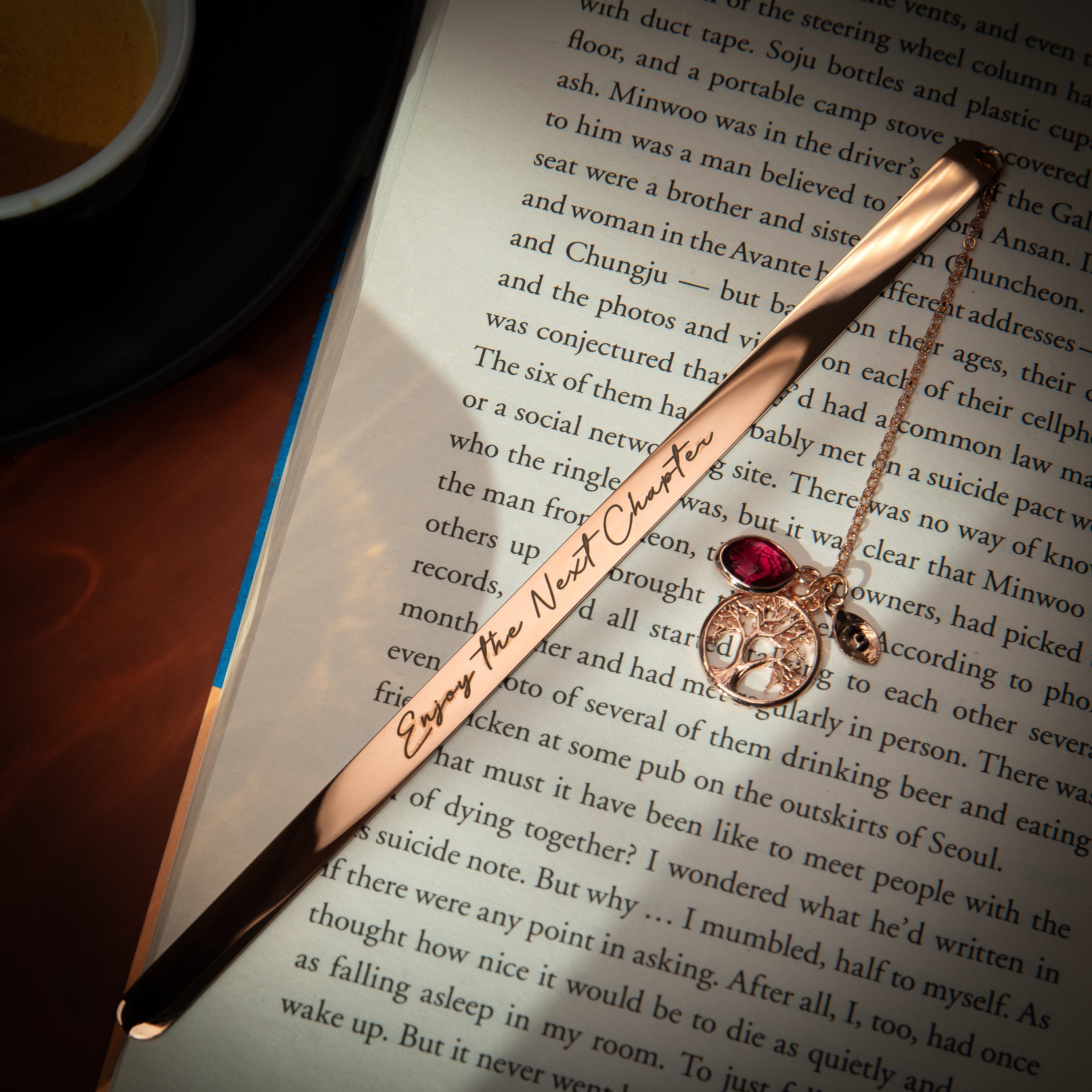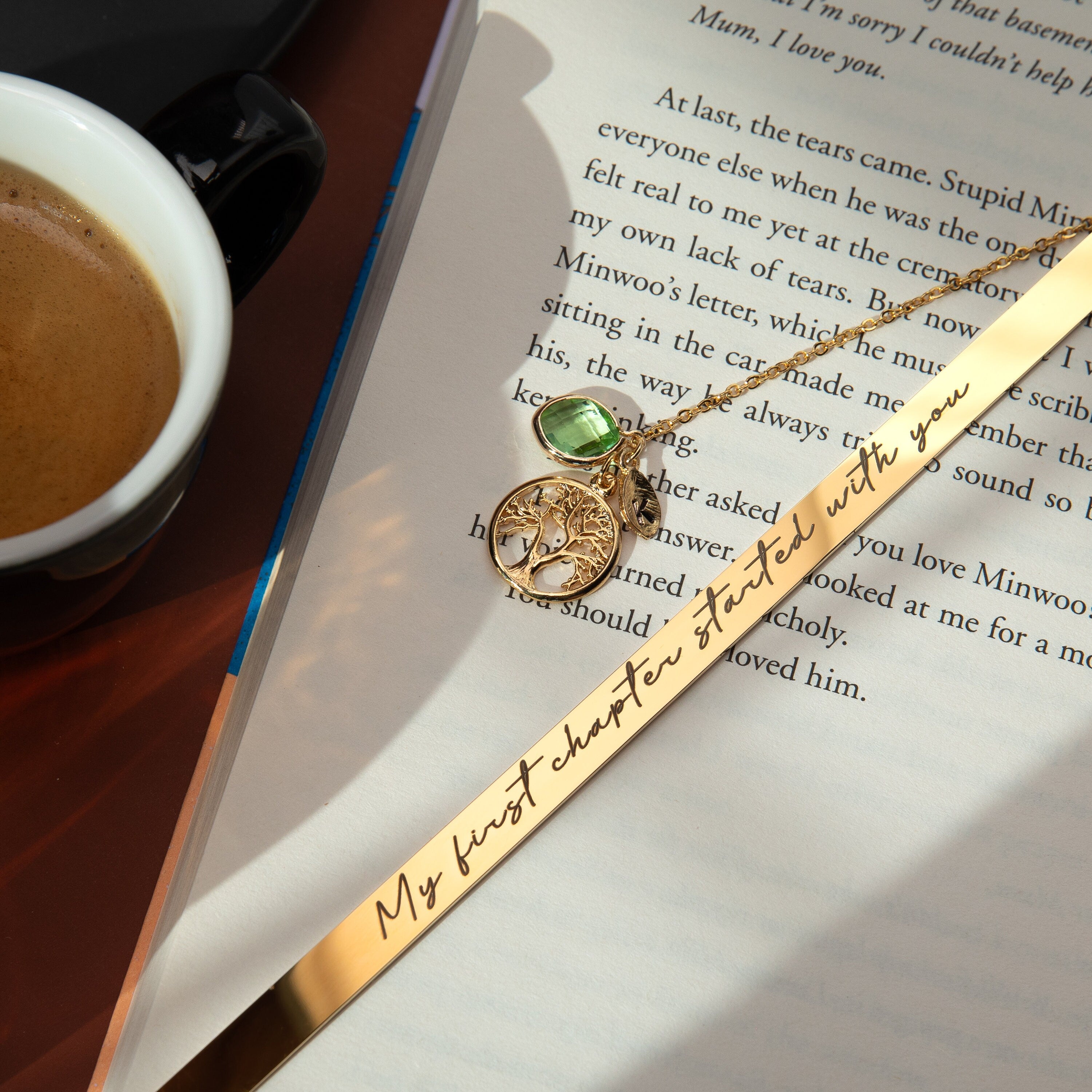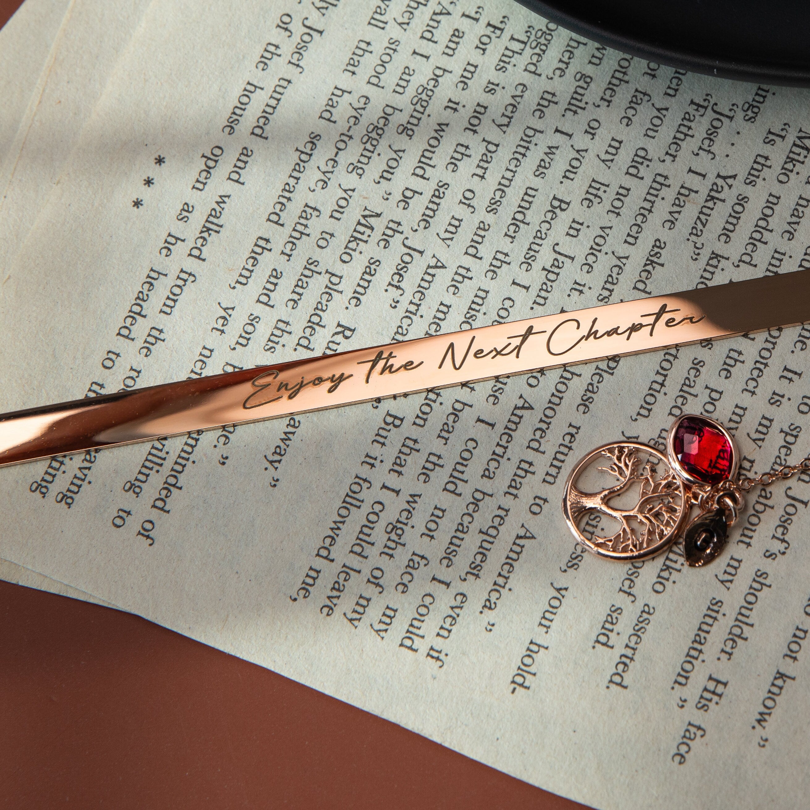 Enhance your reading experience with our Personalized Metal Bookmark featuring a custom birthstone, engraved initial leaf, and symbolic Tree of Life charm. Crafted from high-quality metal, it’s a durable yet elegant keepsake that adds a touch of meaning to every page. Personalize it with your favorite quote or phrase for a truly unique gift for any book lover.