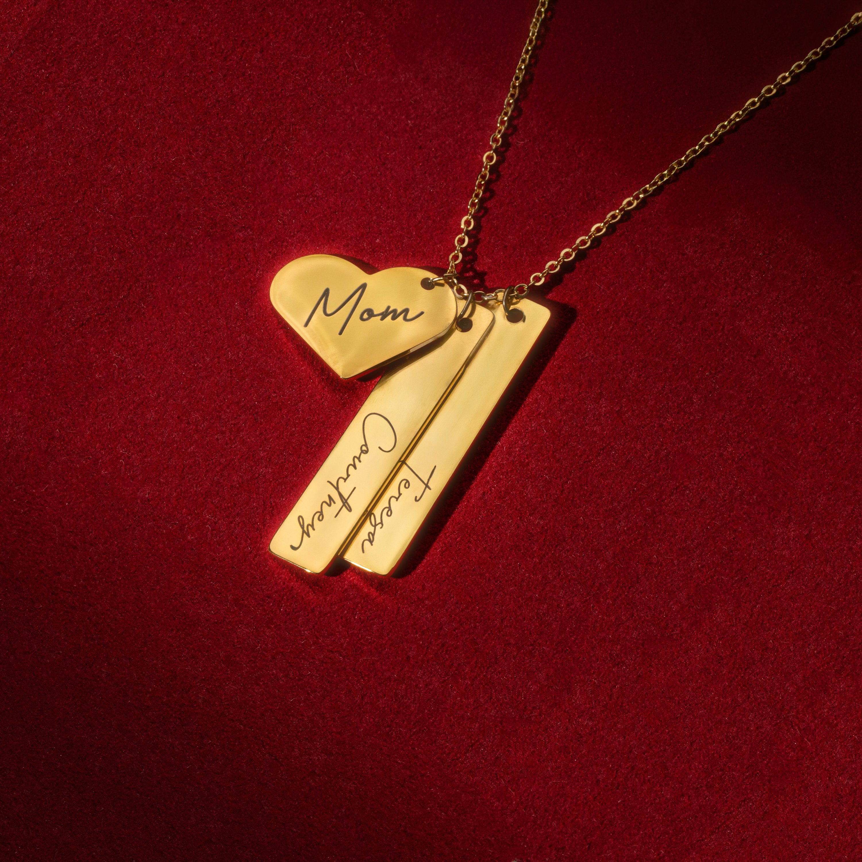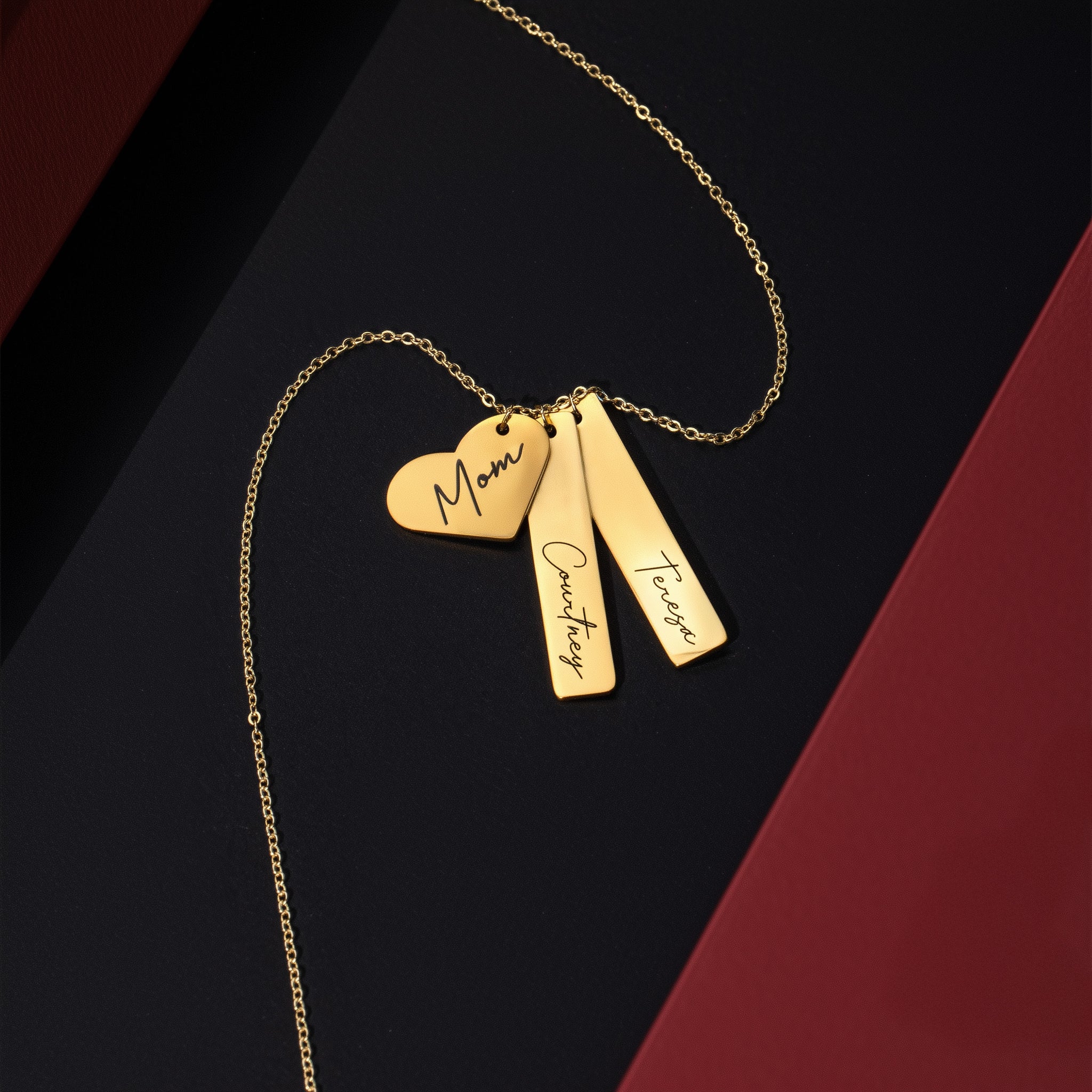 Celebrate connection and love with our custom bar and heart cutout charm necklace. This meaningful piece features engraved vertical bars and a heart charm that nestles perfectly between them, symbolizing the unbreakable bond between family or loved ones. Personalize each charm with names, dates, or words that hold significance to you. Whether gifted for the holidays or kept as a daily reminder of someone special, this necklace is a timeless treasure you’ll cherish forever.