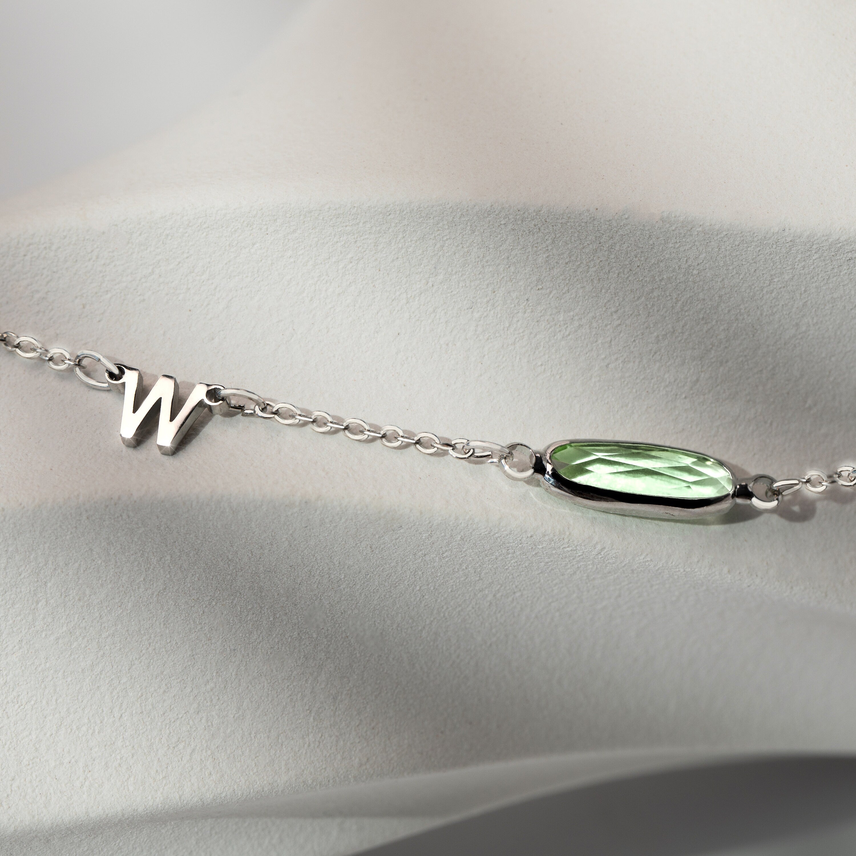 A necklace with a dainty chain and a delicate birthstone charm in the shape of an initial, displayed on a person.